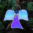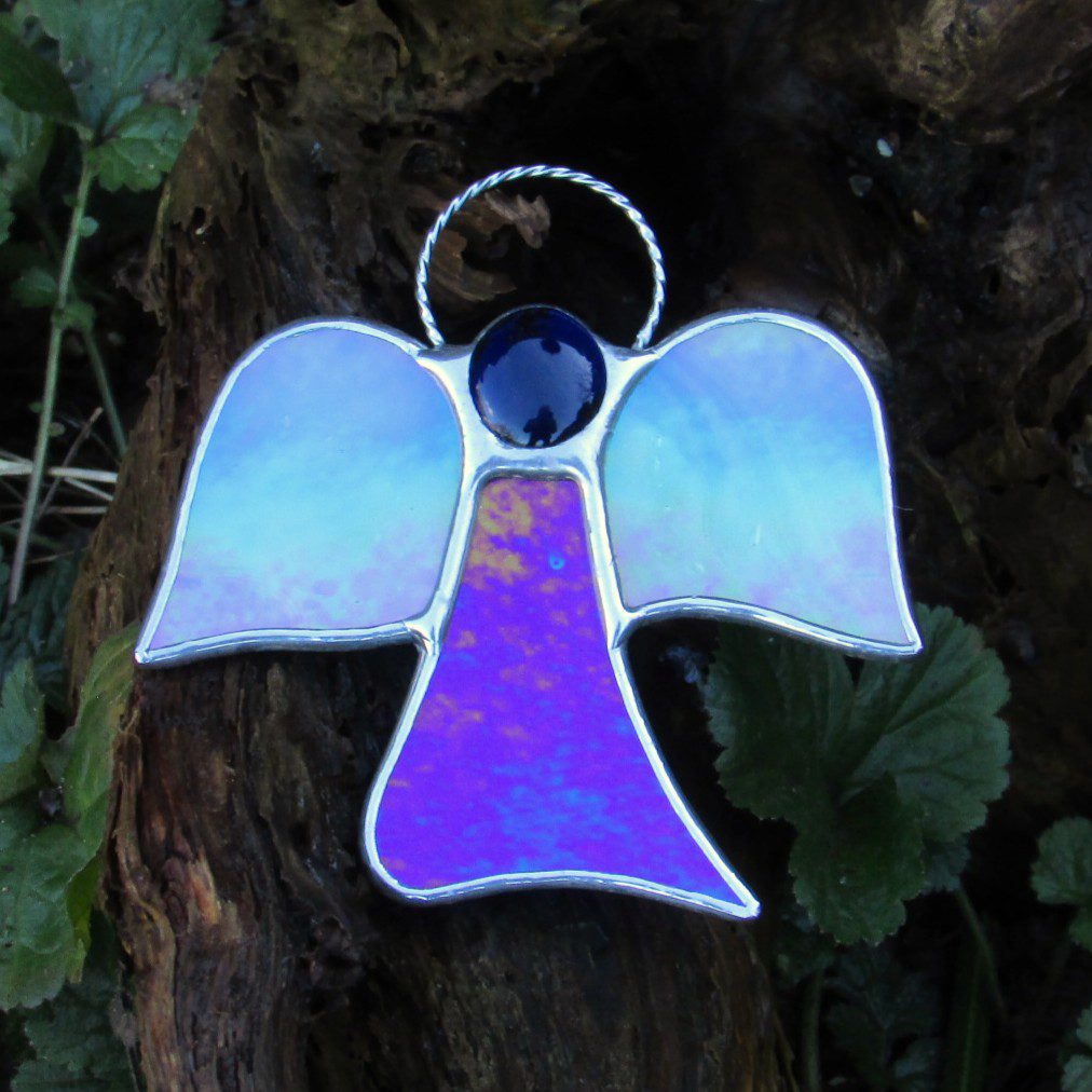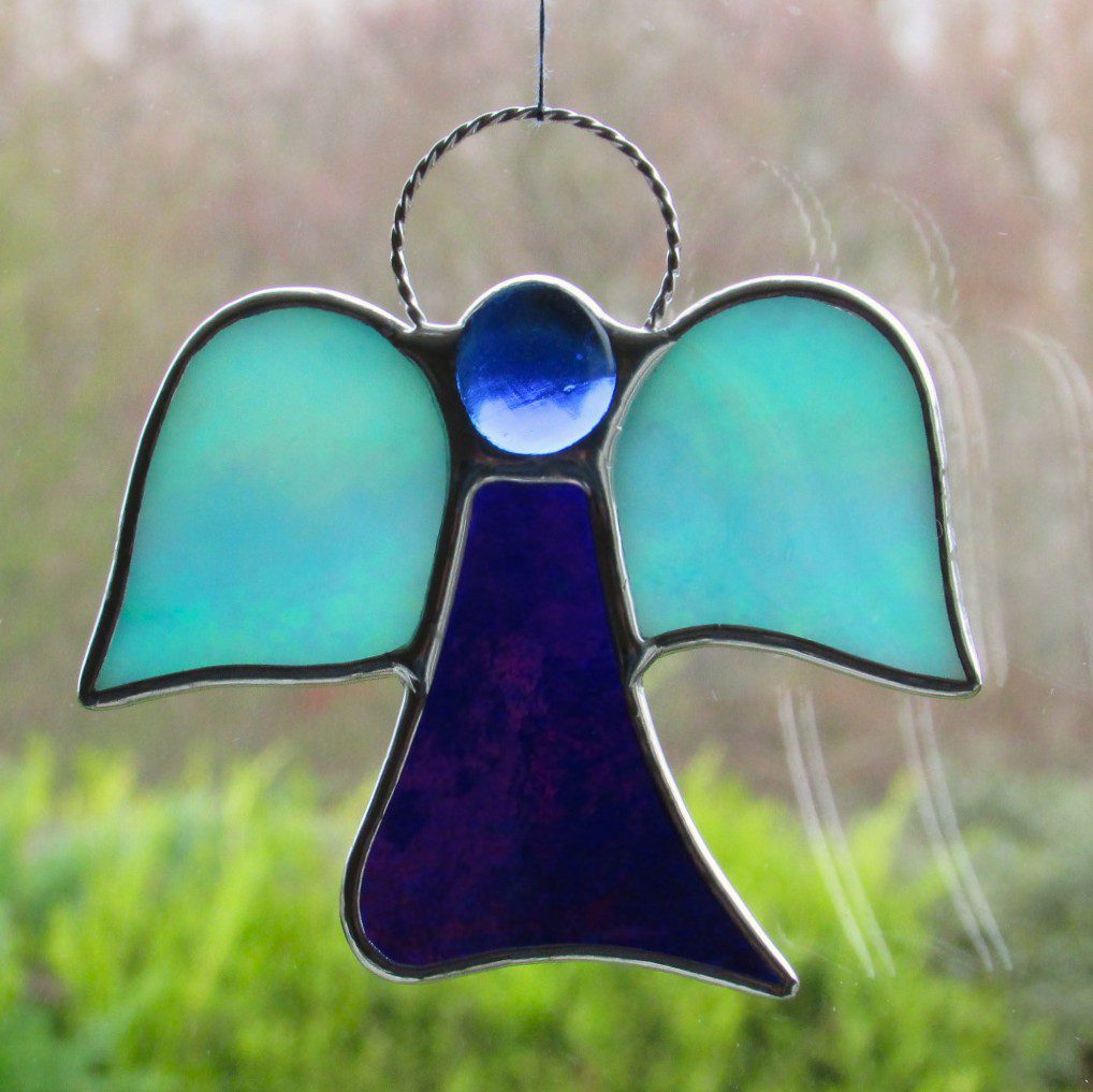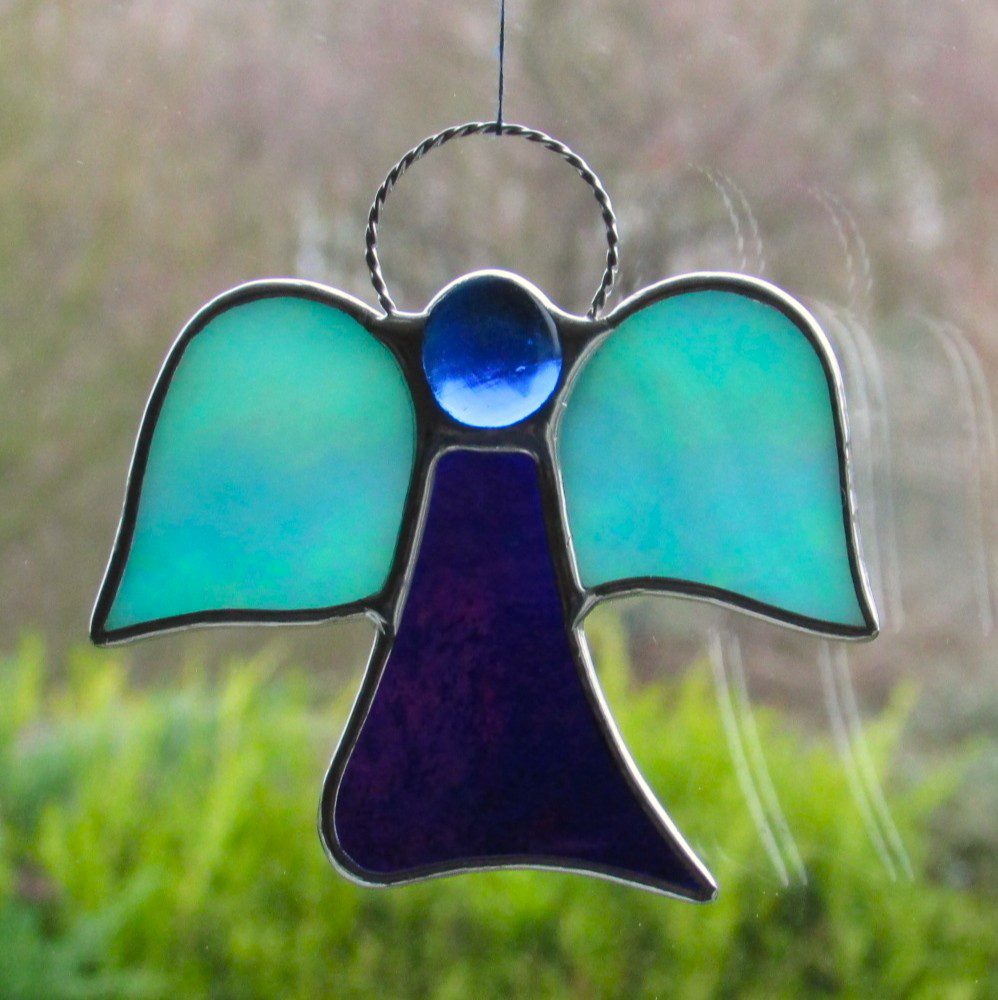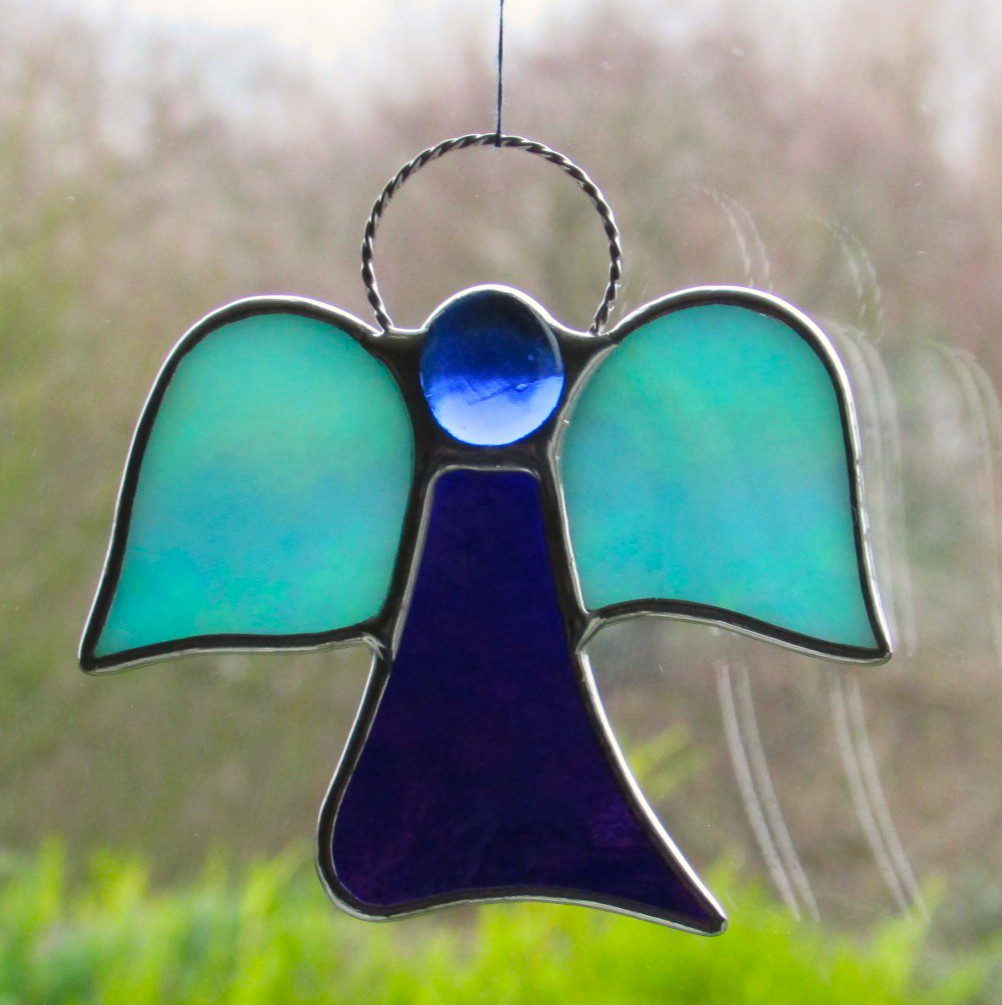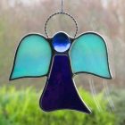 Beautiful stained glass abstract (Angel) I have handcrafted and designed by myself using the traditional copper foiling method. The design is effective with the glass colours two different blues iridescent opalescent glass. A glass glob blue forms the head of the Angel.