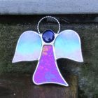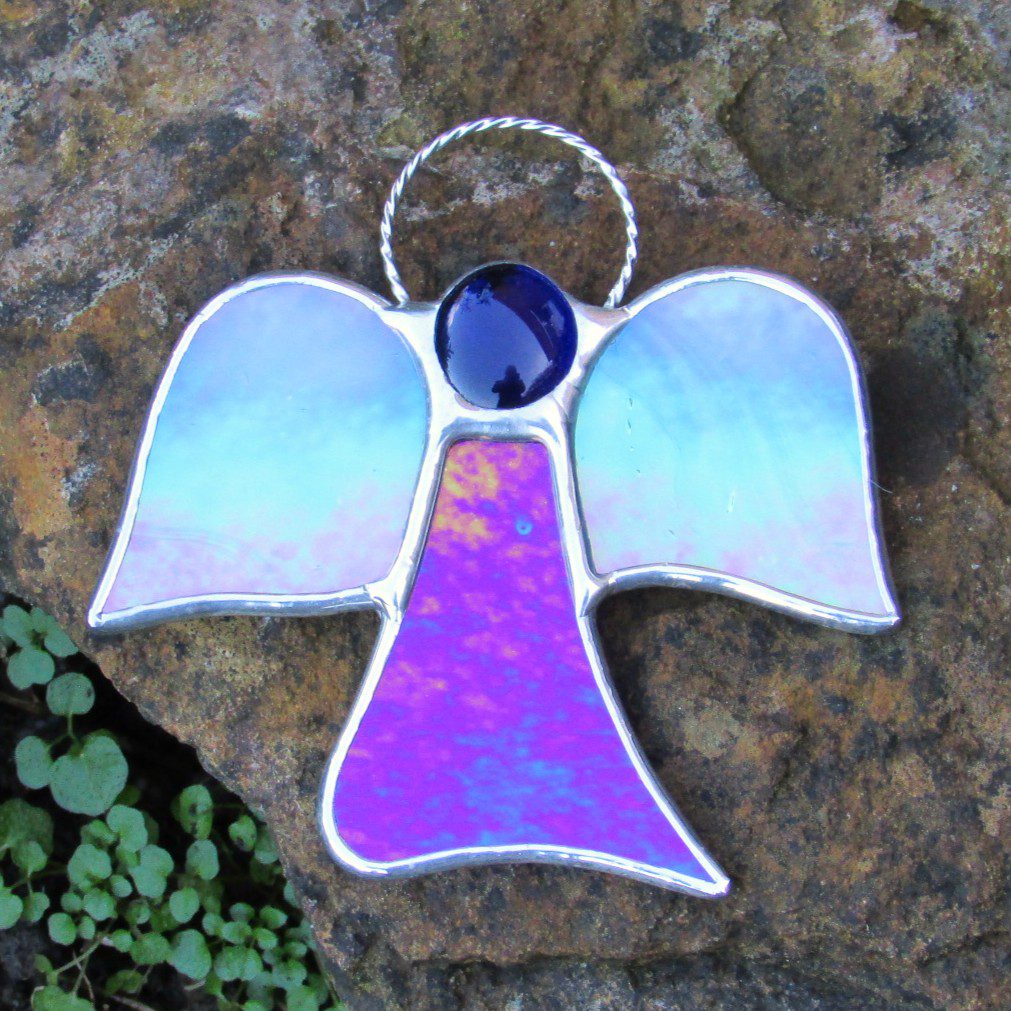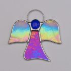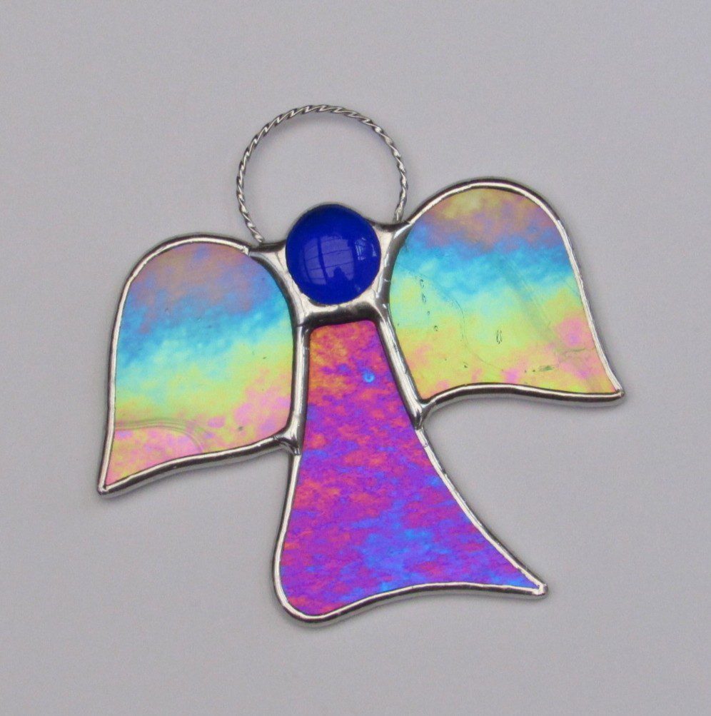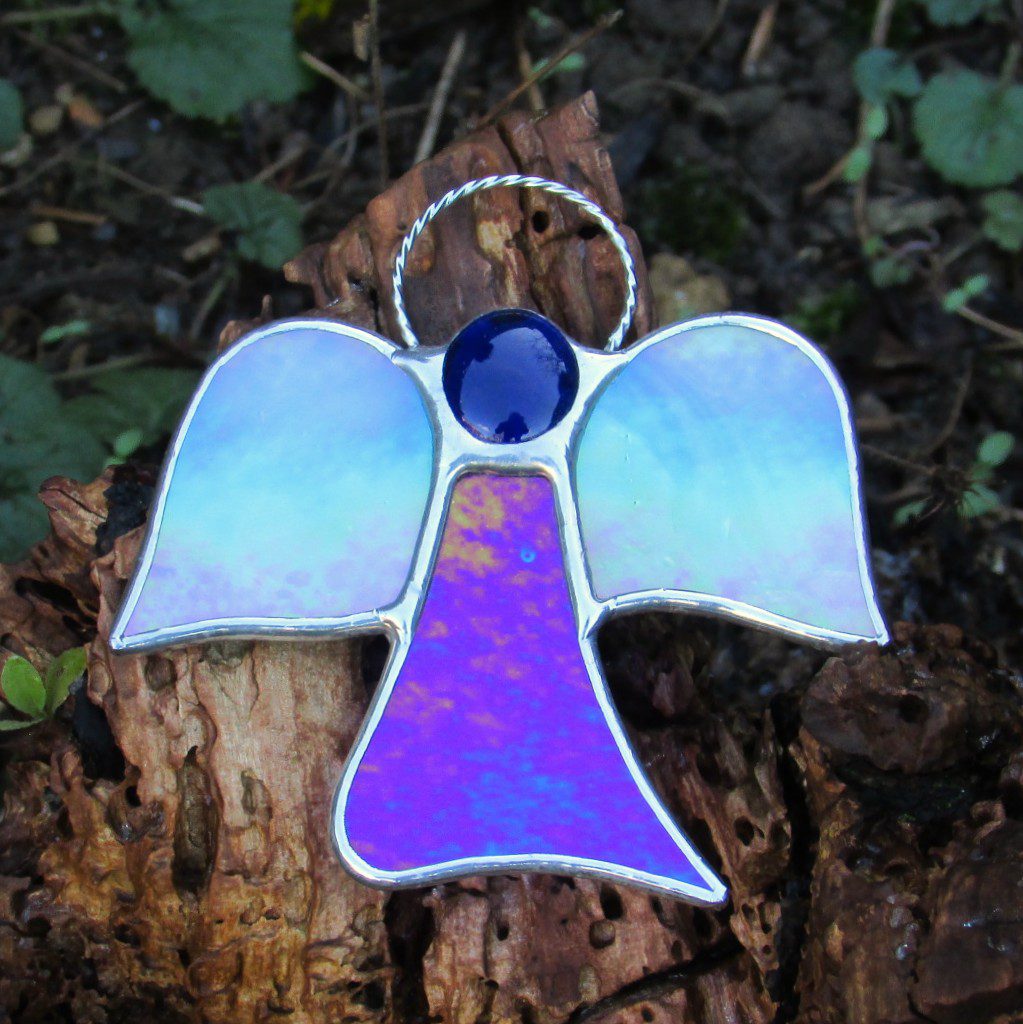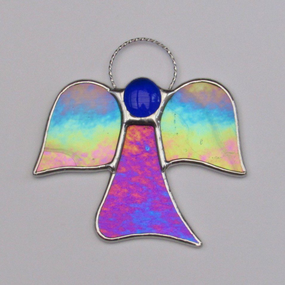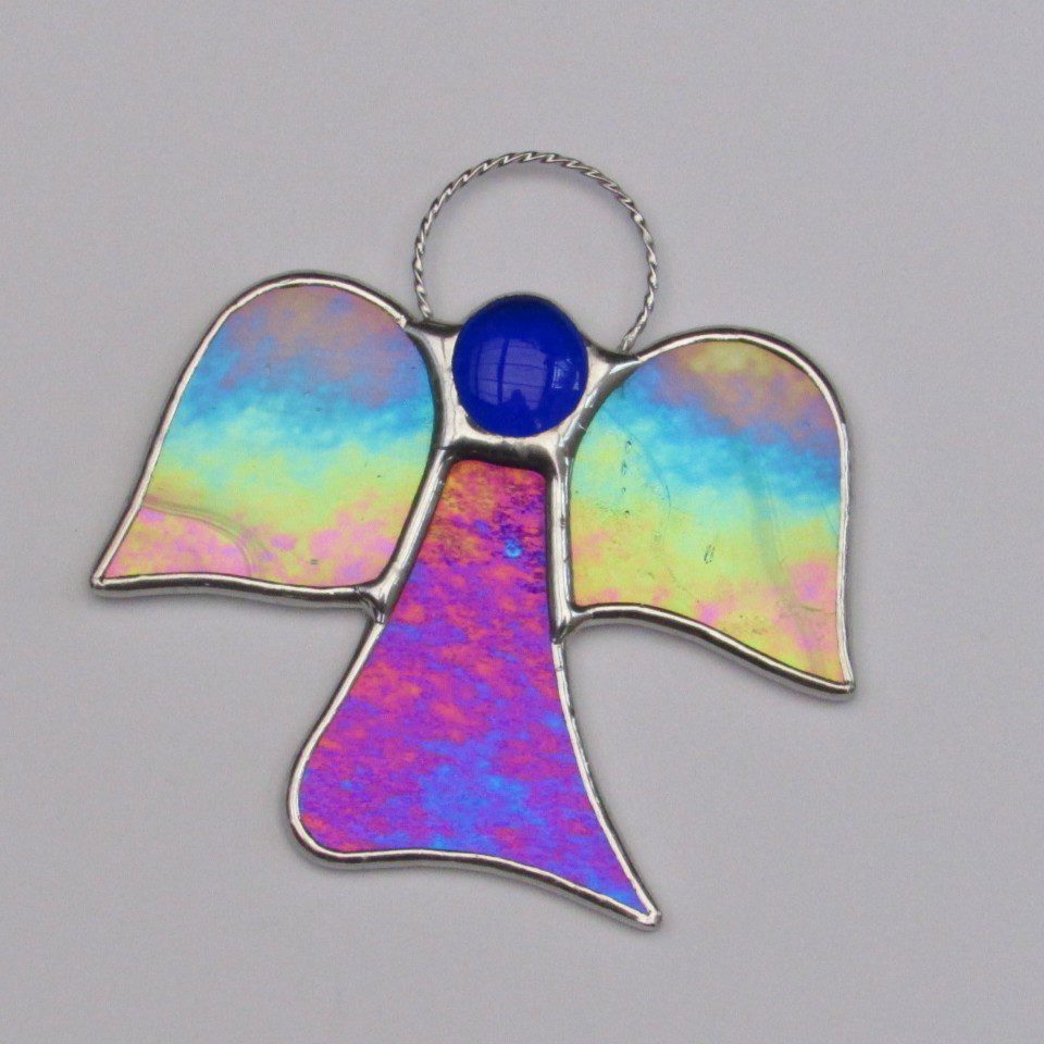 Beautiful stained glass abstract (Angel) I have handcrafted and designed by myself using the traditional copper foiling method. The design is effective with the glass colours two different blues iridescent opalescent glass. A glass glob blue forms the head of the Angel.